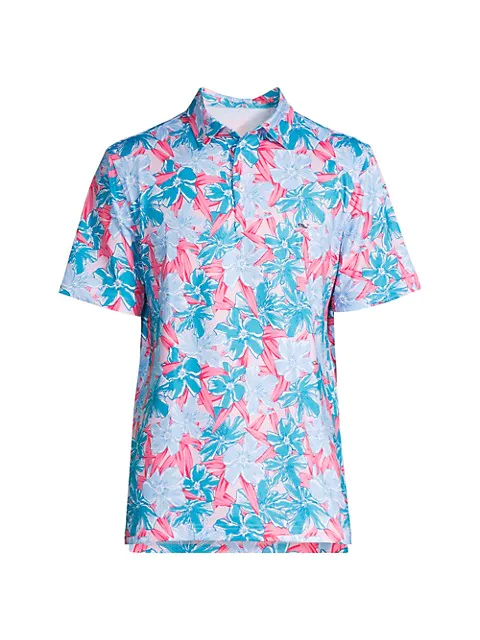 From the Sankaty Collection. Known for their scholar-like attire, New England-based Vineyard Vines works in classic fabrics like cotton and wool. They keep the nautical tradition alive through American staples like zip-up vests and knit sweaters. This polo was named after the Sankaty head golf club and Sankaty lighthouse on the eastern end of Nantucket. This short-sleeve classic style polo in UPF 30+ for sun protection and quick-drying stretch fabric features a vibrant hibiscus floral print.