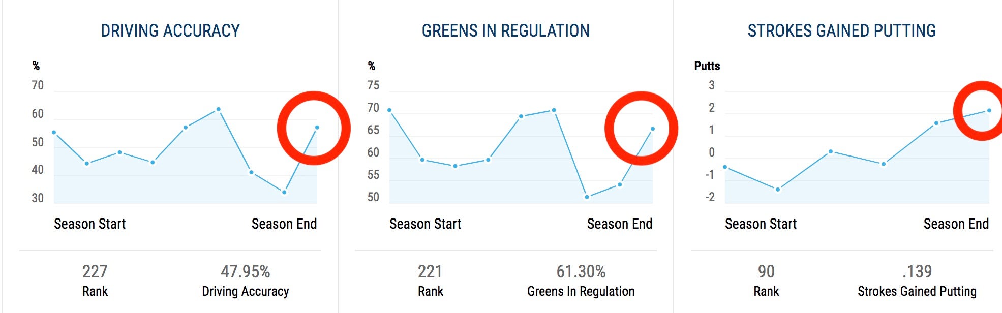 If this is indeed the case, we’ll likely see Spieth drive the ball a little longer in the future, and we may have gotten a glimpse of it last weekend: He averaged 314 yards off the tee this event, vs. 295.6 yards at the same event last year, but with a sample size that small, it’s hard to put too much stock in it.