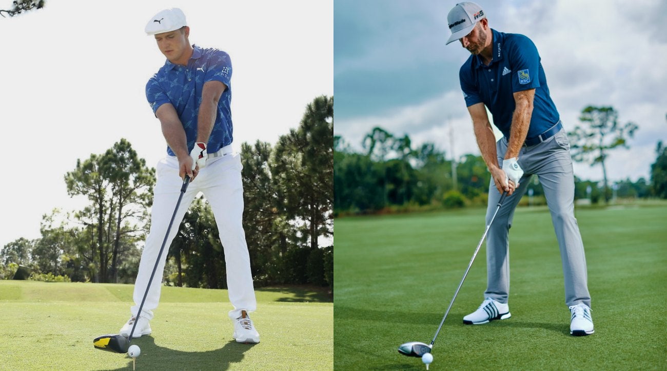 If you want to see your grip strengthen, push your hands towards the ground and watch the toe of the club come off the ground. You will notice that your left wrist will cup or extend more making it look stronger. When it is set like DJ you will notice that you can see three of four knuckles while setting up like Bryson will show you only one or two knuckles.