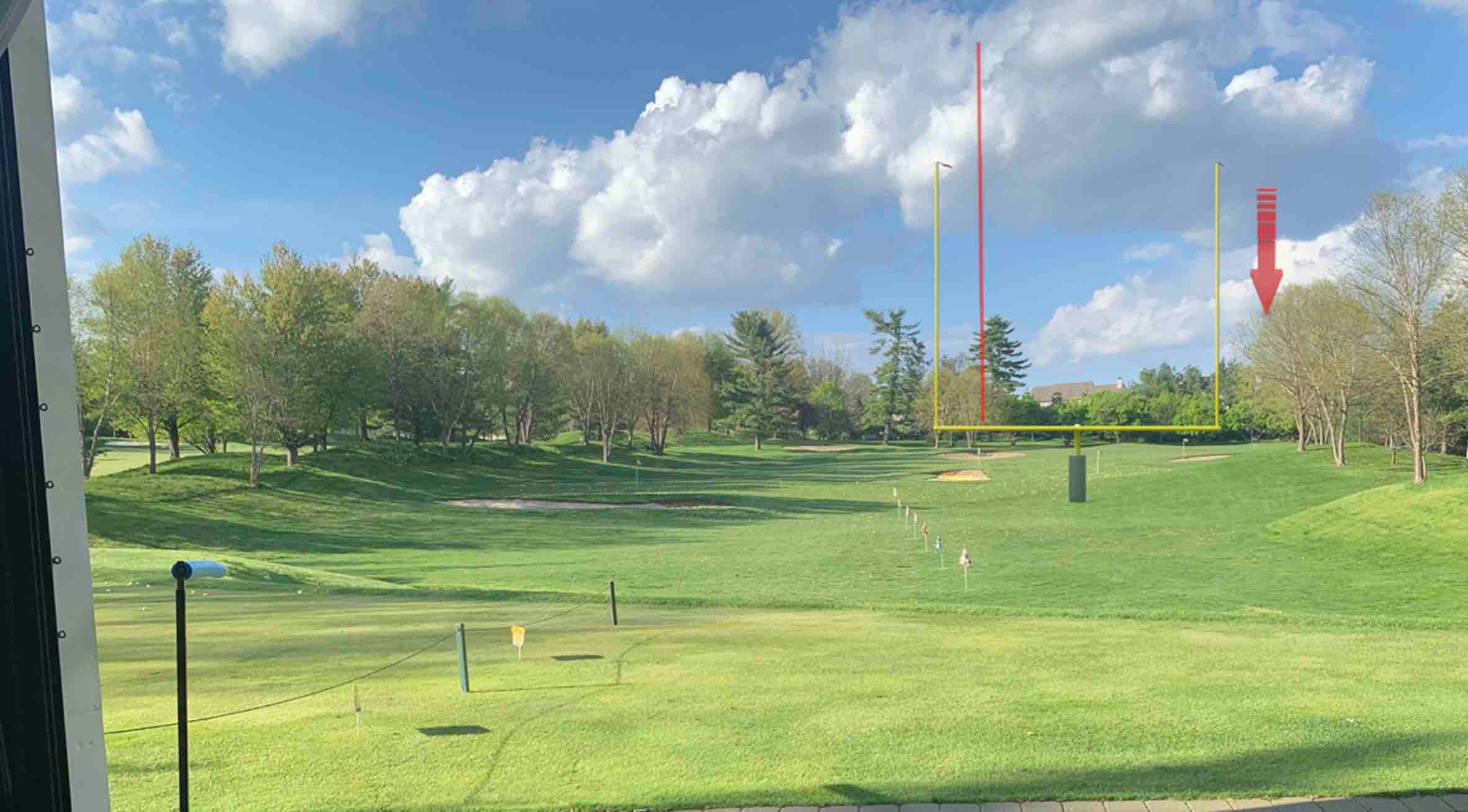 As I’m looking at the fairway, I’m starting to pay attention to where I want to start my little left to right fade. I’m going to visualize hitting my golf ball through a field goal. I see that shot shape starting at the left side of the field goal and moving right into the middle of the fairway. That red line is my aim line and I know there is some additional fairway to the right of the field goal. That added knowledge of the fairway makes it much easier to hit the shot. Now I’m bringing that image back to the range where I’m used to hitting my driver. I can now see the range with the same aim line and field goal. That range image is going to make it so much easier for me to make my swing on such a difficult hole.
