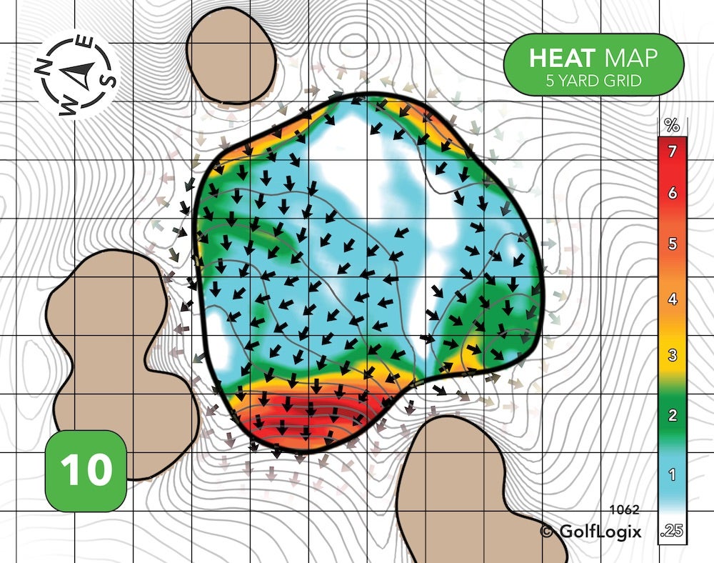 Two different ridges effectively cordon-off the green into three sections: Very front-left, back-right, and everywhere else.
