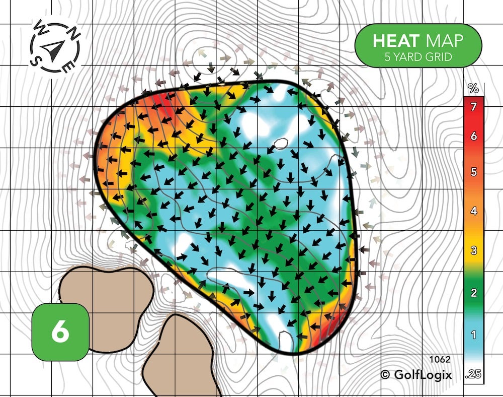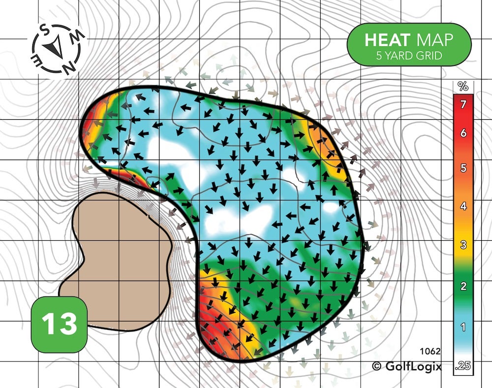 The green runs almost exclusively back-to-front. Hitting your ball past the pin, if the hole is up front, could leave you with a slippery putt, and a drop-off long right could threaten those who try to get greedy if and when the pin is on that crown.