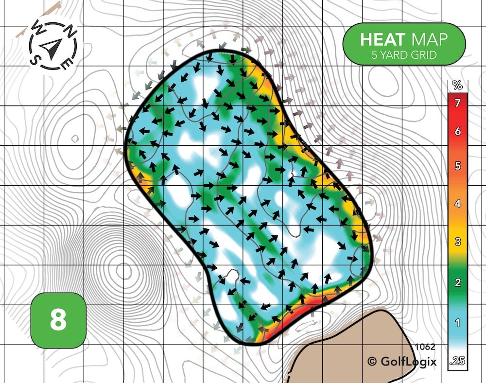 A spinny wedge could potentially funnel away from you on green at the short, ~340-yard par-4 7th. Control the spin coming into this one, and it provides another good birdie opportunity.