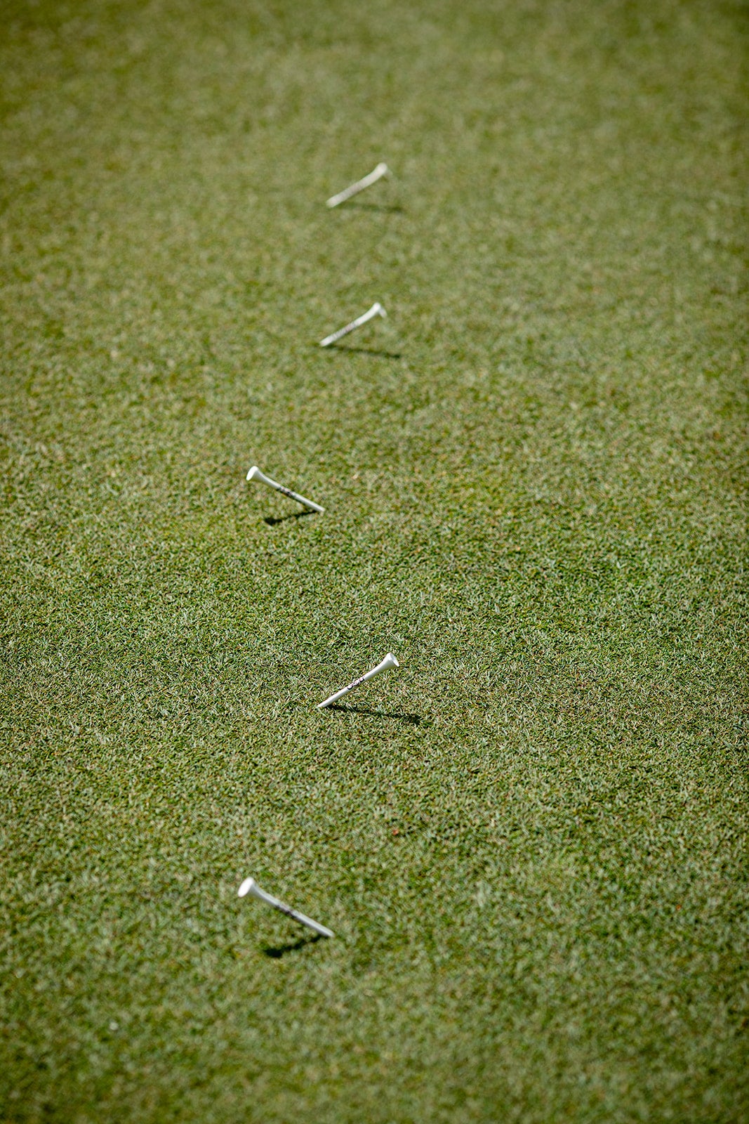 As you go, begin placing tees into the ground four, five, six, seven and eight feet away from the hole. You’re going to do this in each of the four directions around the cup, which means you’ll need 2o tees total.