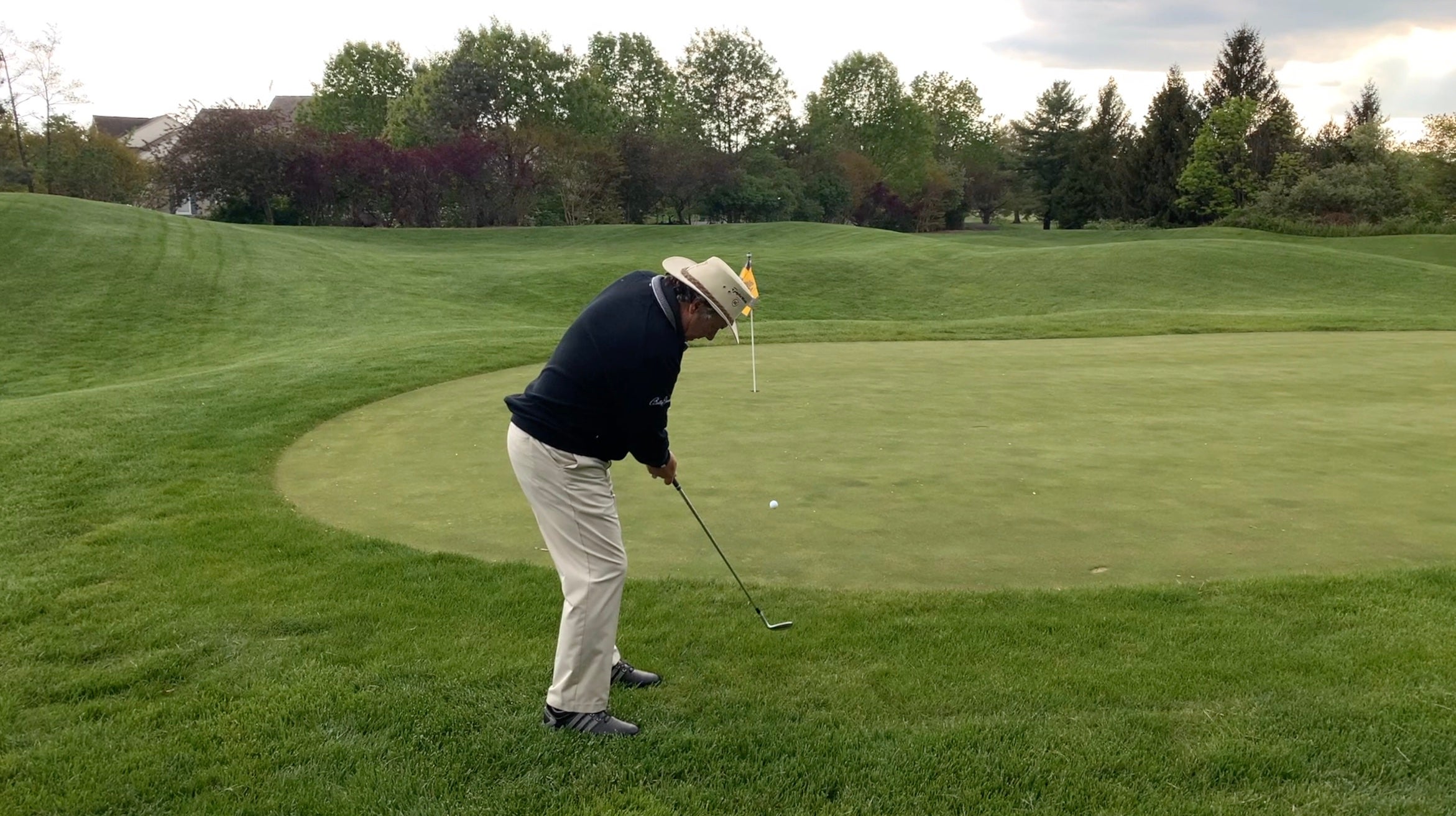 I could use my chipping technique, but it’s real fast and I don’t want to put any unneeded power into the shot. Instead, I’m going to what is called a “Chip Putt” with my 60 degree wedge.