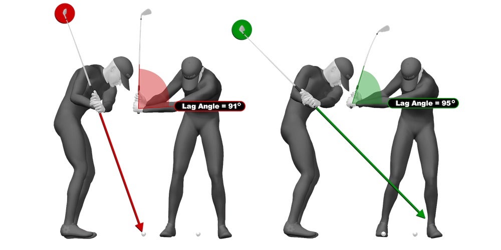 Think of lag as the angle between the shaft and your left arm. The smaller the angle, the more lag you have. But as you can see from our two golfers, not all lag is the same.