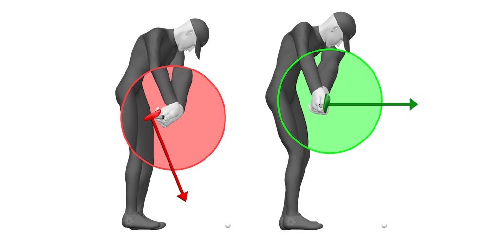 Compare that to the opposite movement we see so often from am golfers. Because they’re trying to be passive or leave the hands up, the start direction moves out towards the ball. This causes a hand path that starts out then curves down. That’s a big problem for rotation and club face control, and a major swing killer.