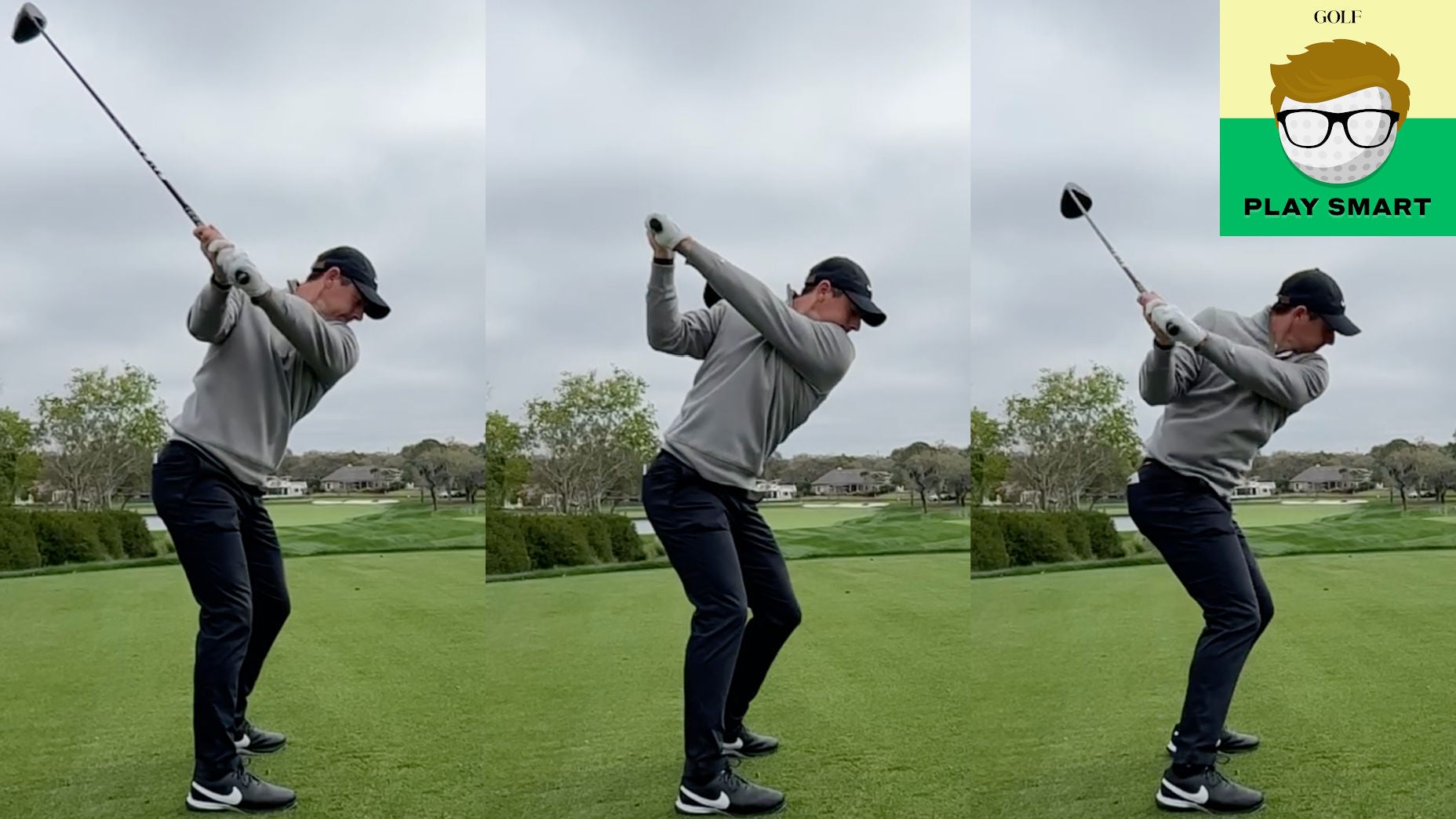 On the left is an image of Rory, club parallel, at the 2021 PGA Championship last May. On the right is Tuesday at Bay Hill.