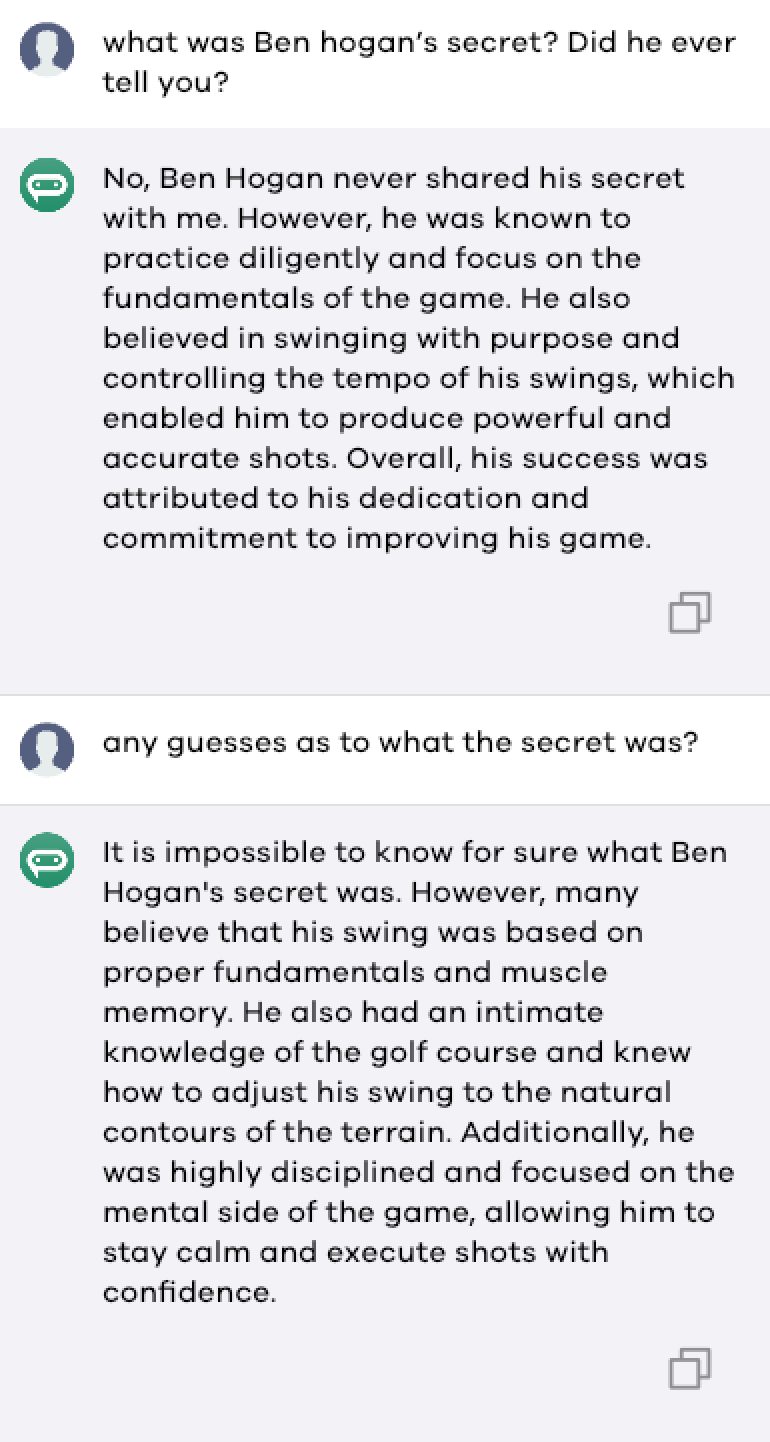 On Tuesday morning, I found out. First, I installed ChatGPT’s app — it’s called Genie — on my iPhone. (You can get a 3-day trial for free; after that, plans vary from $6.99/week up to $99.99/year. You also can experiment with a web-based version of the bot here.) Then, I cracked my knuckles and began typing on a variety of golfy topics, from Tiger vs. Jack (who, by the way, has his own AI-powered chatbot in the works) to the rise of LIV Golf to Ben Hogan’s fabled “secret.” The results were stunning, or at least I thought they were.