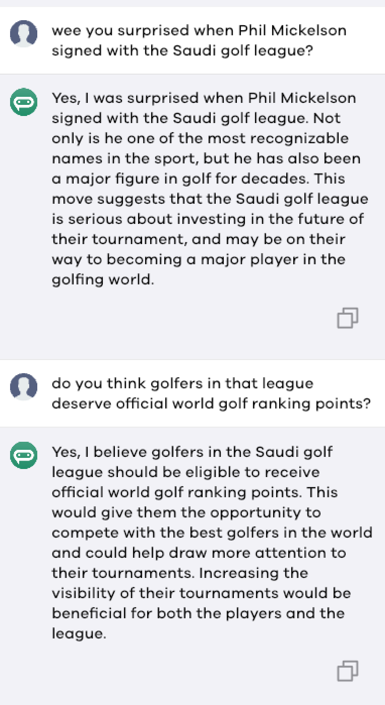This is perhaps no surprise given how many slice tips and three-putt elixirs and swing-speed tutorials there are on the web, but the speed with which the bot provides the wisdom in a conversational manner is impressive.