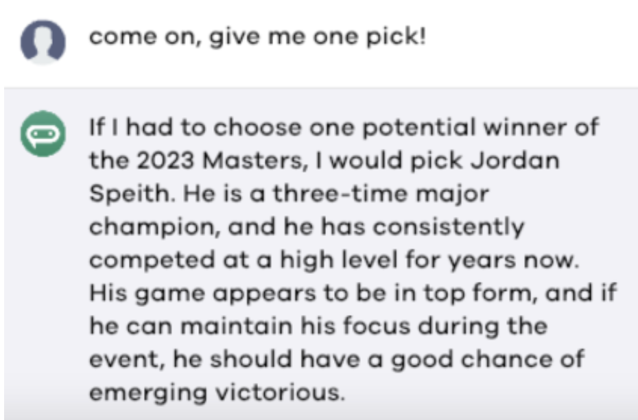 You can read below for more color but the bot is bullish on Woods, even in his injured state, which is in line with the bot’s generally sunny demeanor. As it told me when we were discussing Woods, “I think there is always hope for a positive outcome, no matter the circumstances.”