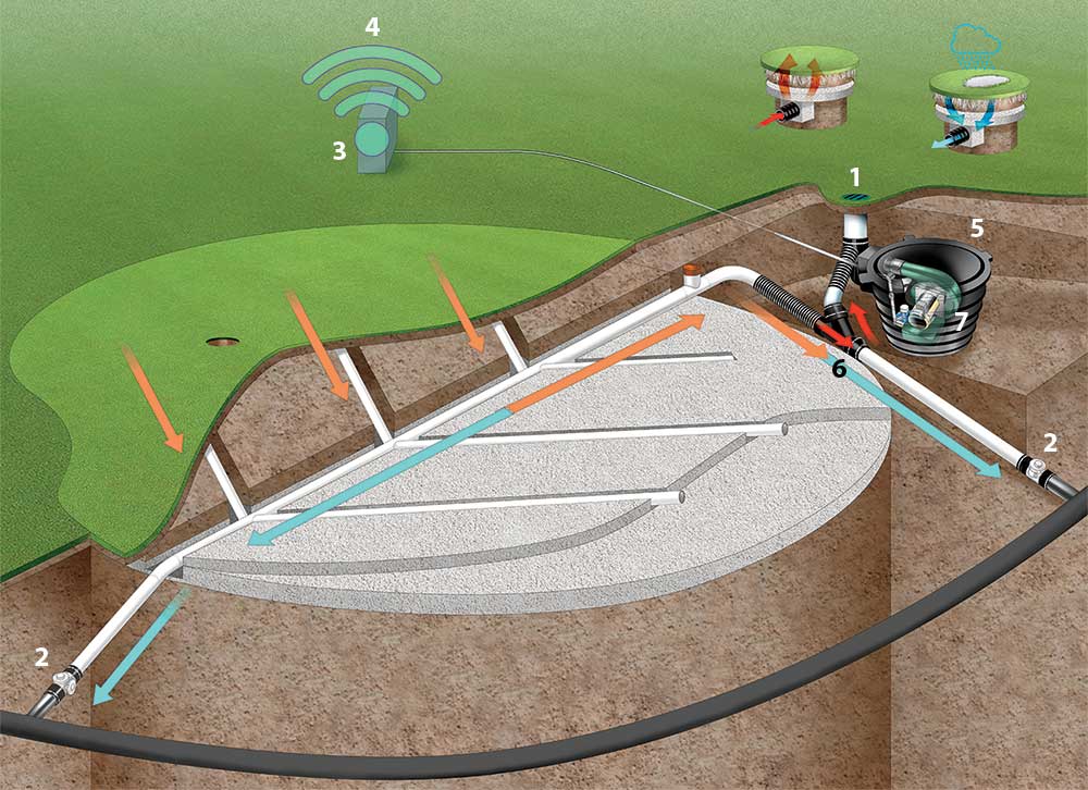 An above-ground or vaulted unit placed at the high end of the green contains the blower and sensor, and the unit connects the system to the green’s drainage pipes.