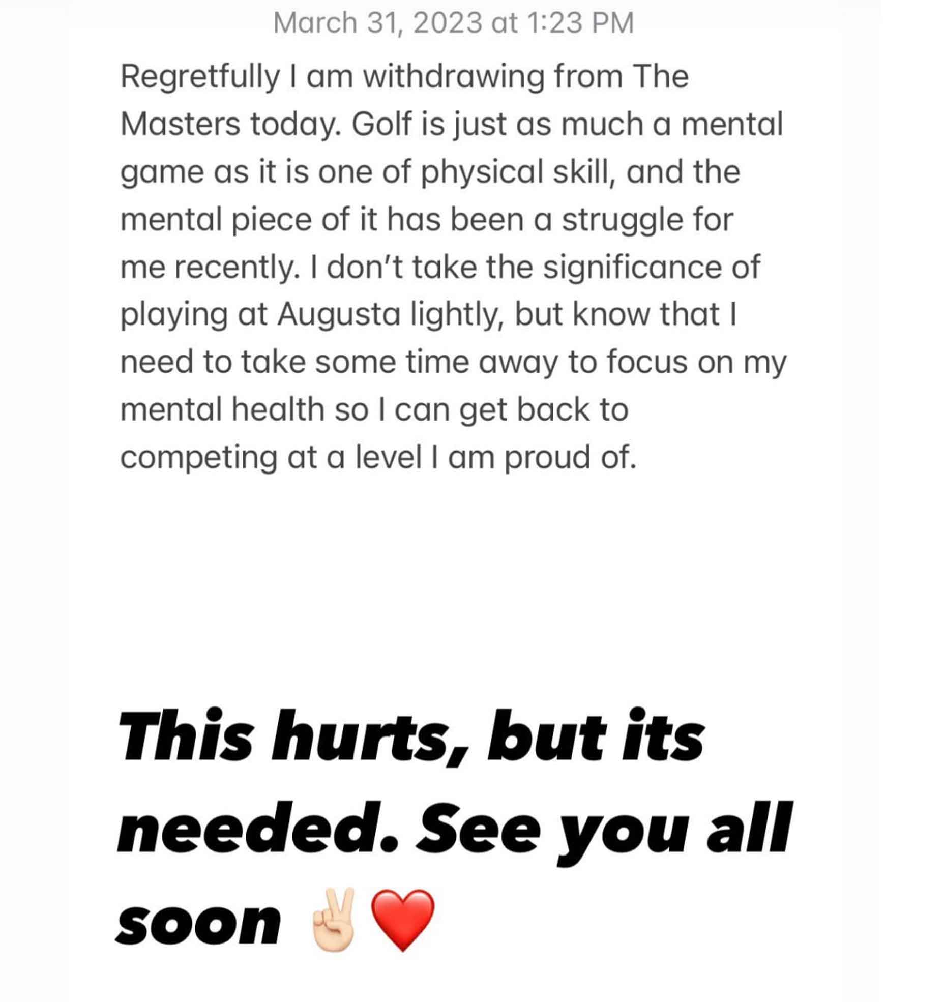 “Regretfully I am withdrawing from The Masters today,” Wise wrote. “Golf is just as much a mental game as it is one of physical skill, and the mental piece of it has been a struggle for me recently. I don’t take the significance of playing at Augusta lightly, but know that I need to take some time away to focus on my mental health so I can get back to competing at a level I am proud of.”