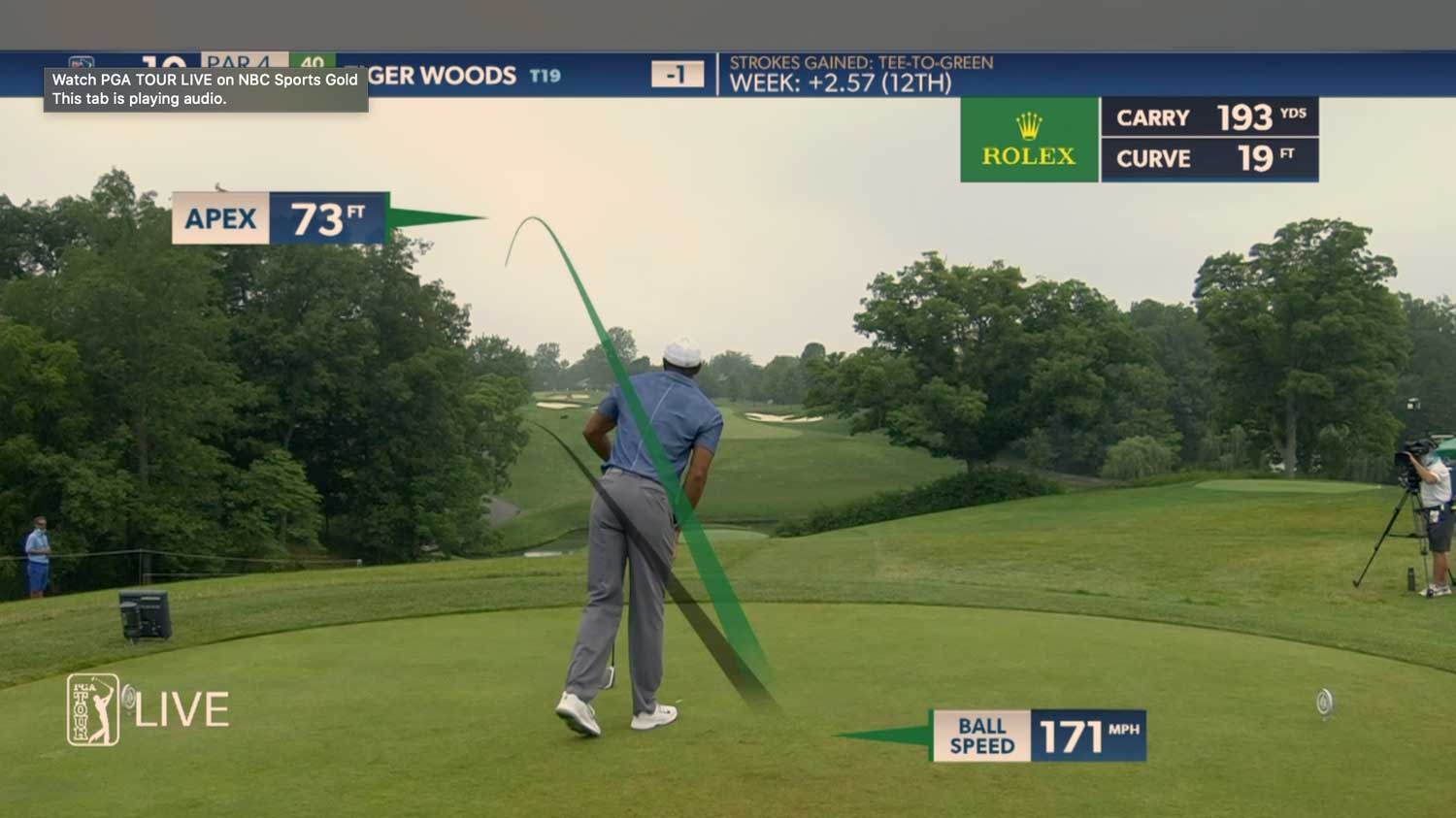 Tiger misses far right on his first tee shot today. Worst tee shot of the week thus far. Luckily for him the trees flanking the right side knocked his ball down and kept it in play. Will have to punch out and hope to get up in down if he wants to make birdie.