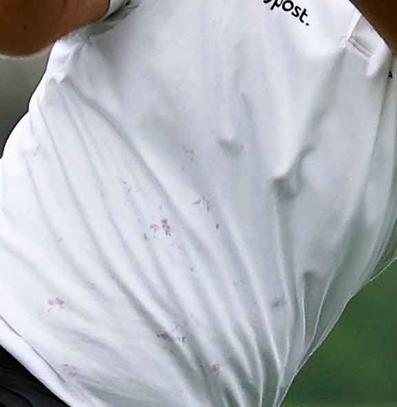 “I started the hole with a pure white shirt and afterwards I had purple and pink and every other color on it,” Reed said Saturday afternoon. “Looked like I had a tie-dyed shirt on because I was having to dig trying to find my golf ball.”