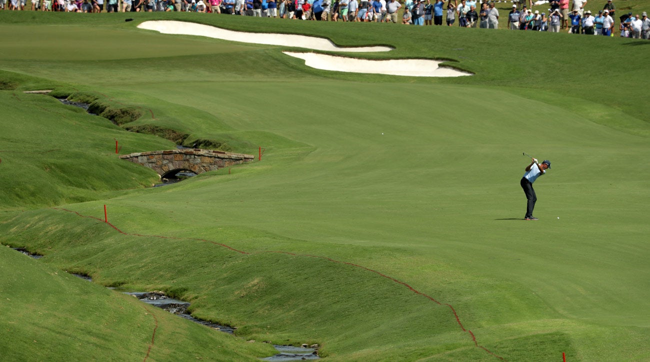 The final test in the “The Green Mile” is the par-4 18th. The hole, which runs 494 yards long, “is consistently one of the toughest finishing holes in golf. Players must avoid a bunker on the right, as well as a creek that meanders along the entire left side of the narrow fairway,” according to PGA.com. Jason Day saw his chances of a win slip away with a quadruple-bogey 8 on 18 in the third round.
